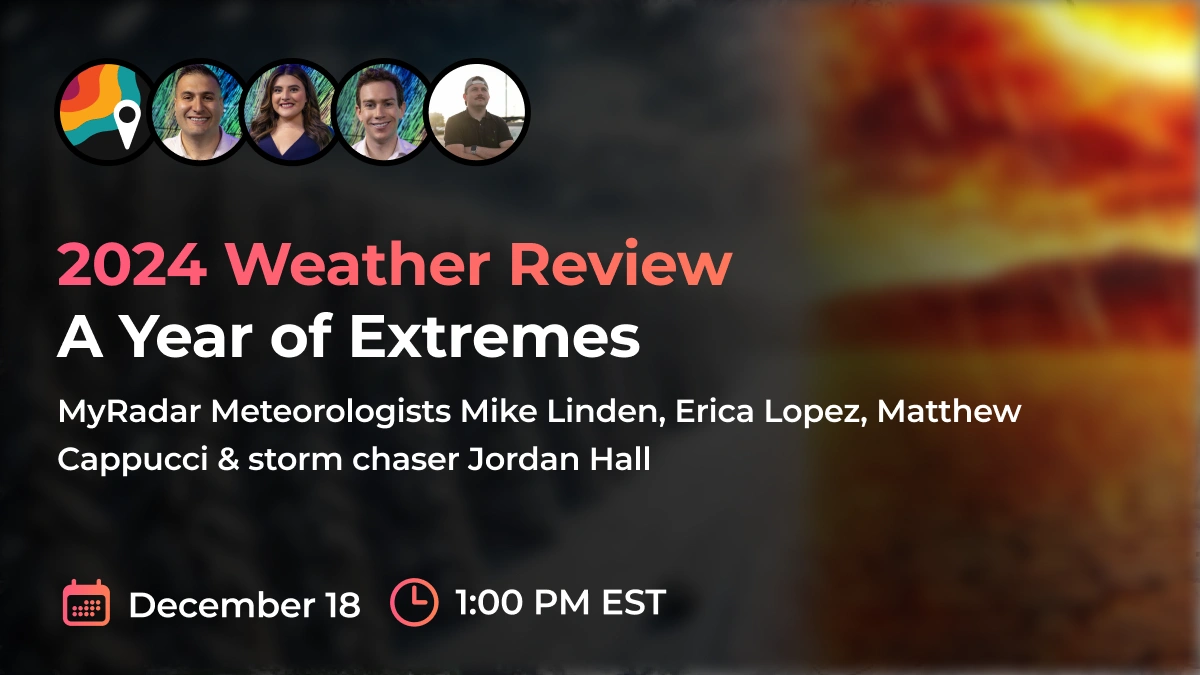 Join MyRadar meteorologists Mike Linden, Erica Lopez, and Matthew Cappucci, along with storm chaser Jordan Hall, as they unpack 2024’s most significant weather events. From January’s Arctic outbreak and spring tornadoes to summer hurricanes and November’s West Coast bomb cyclone, we’ll explore the science and stories behind the storms, featuring stunning satellite imagery and firsthand accounts. Don’t miss this chance to relive the year’s wildest weather and gain expert insights. Reserve your spot now!